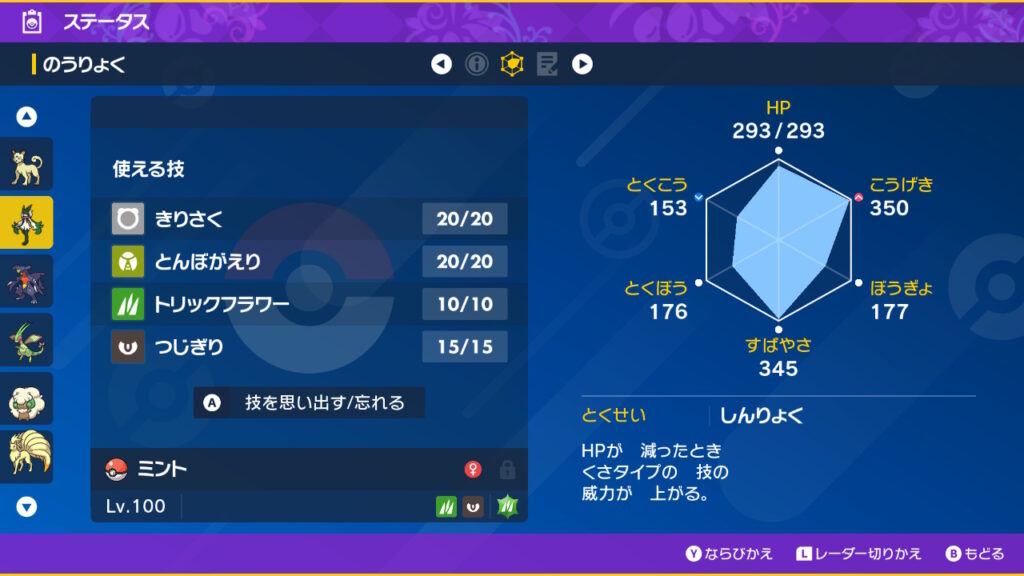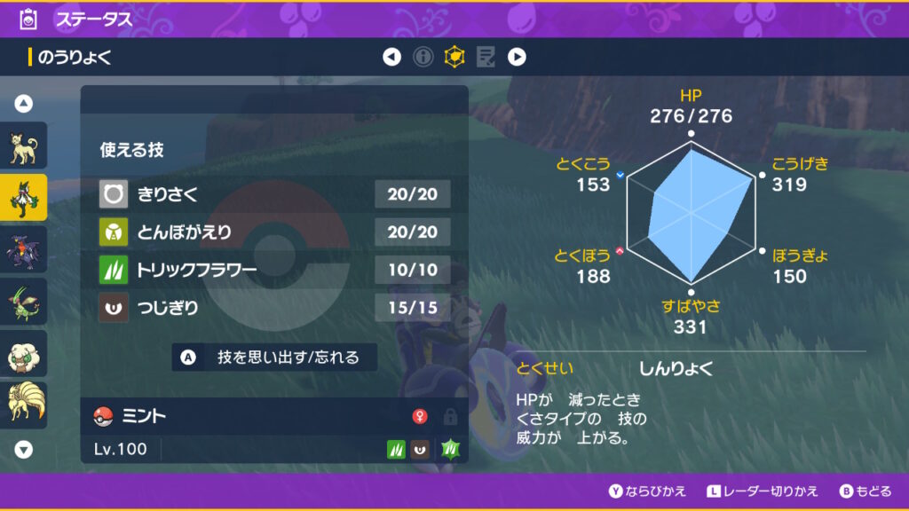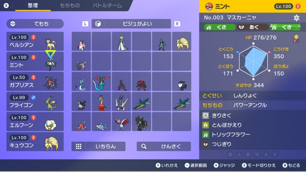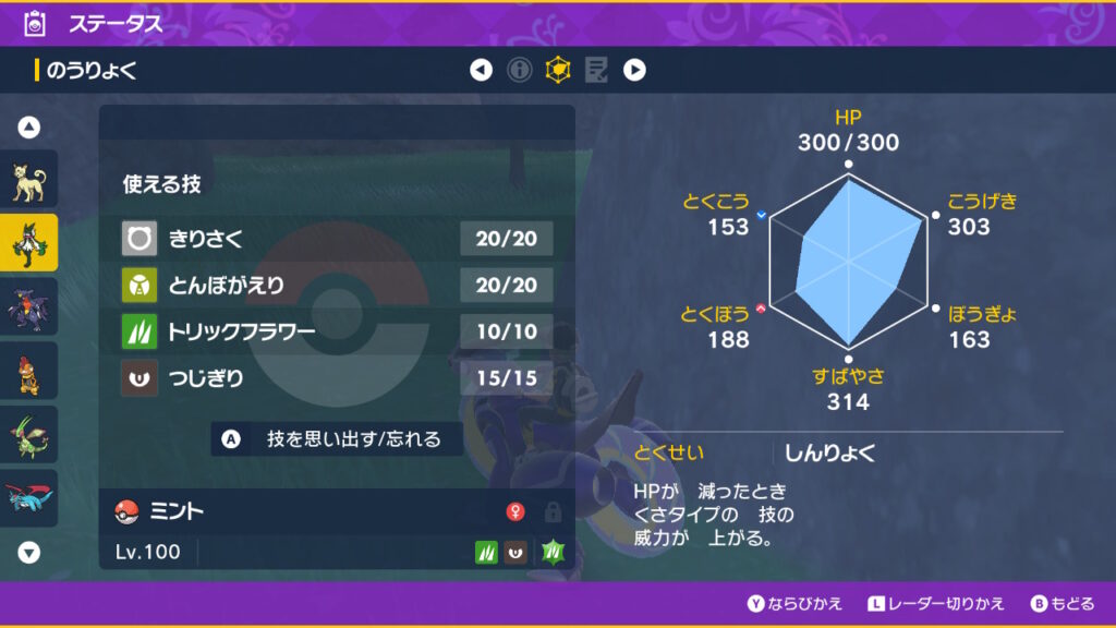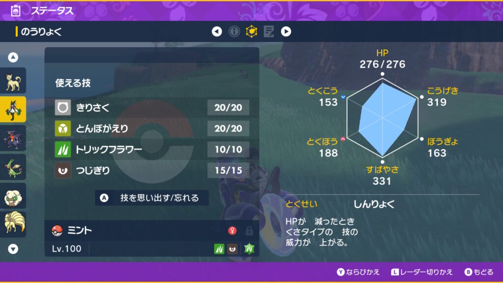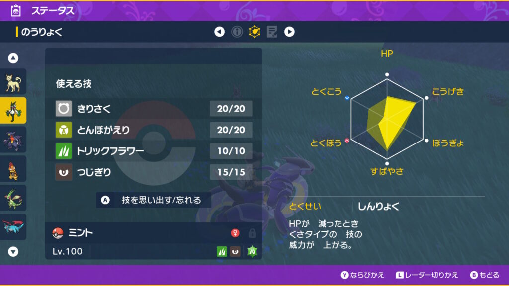 優秀な物理アタッカーとして冒険を始めた日から殿堂入り、そしてブルべリーグを突破してテラパゴス撃破まで旅に着いてきてくれました。トリックフラワーの特殊演出がかっこいいです。