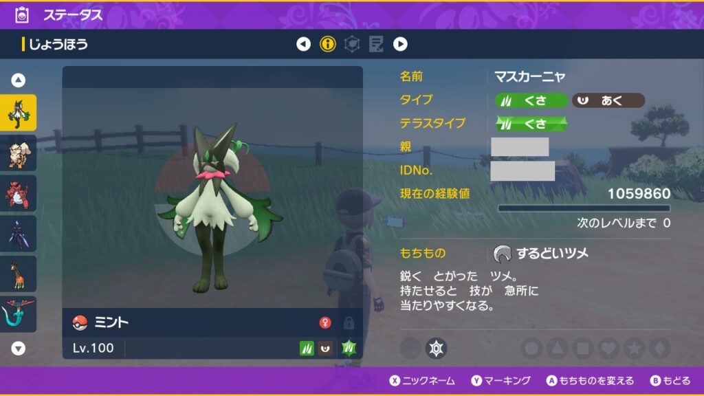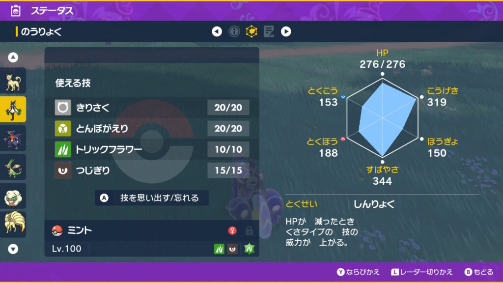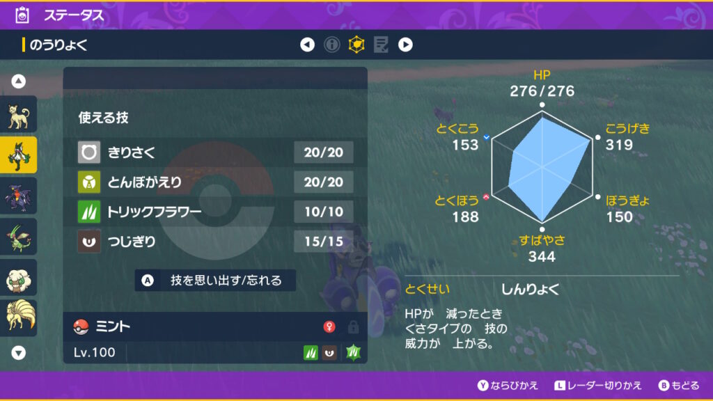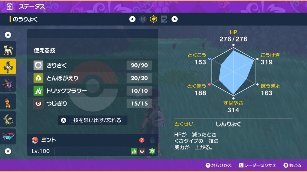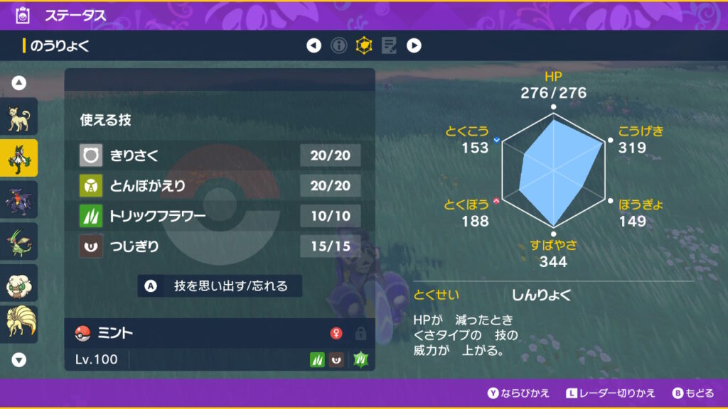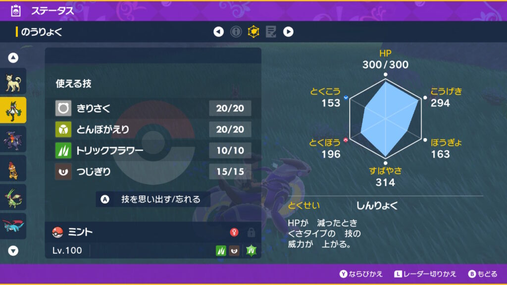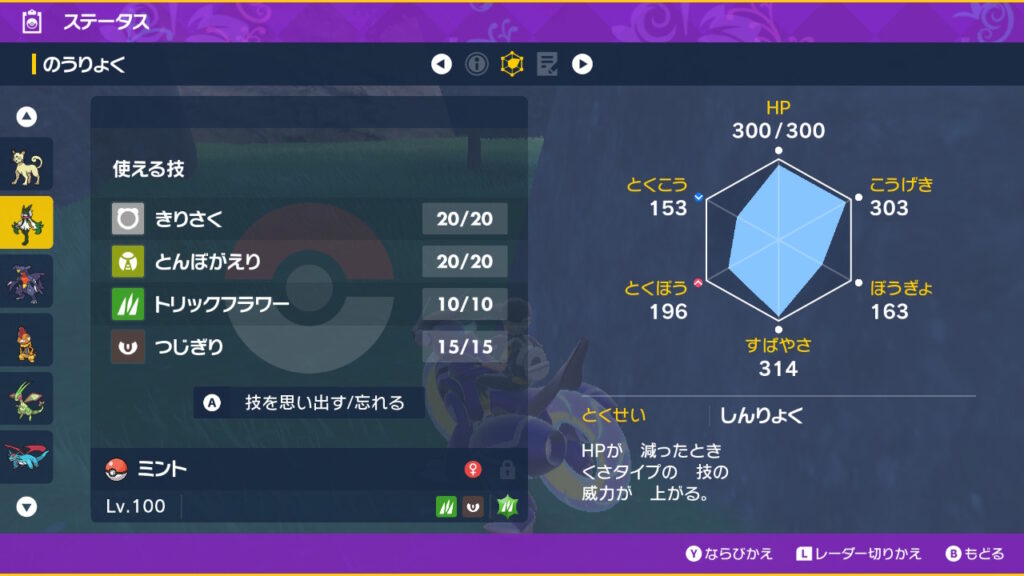 優秀な物理アタッカーとして冒険を始めた日から殿堂入り、そしてブルべリーグを突破してテラパゴス撃破まで旅に着いてきてくれました。トリックフラワーの特殊演出がかっこいいです。