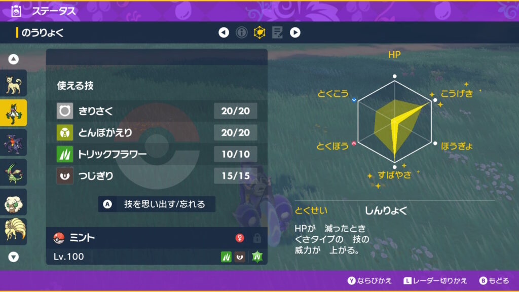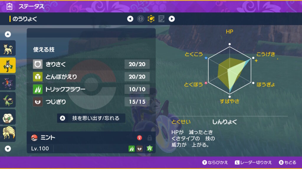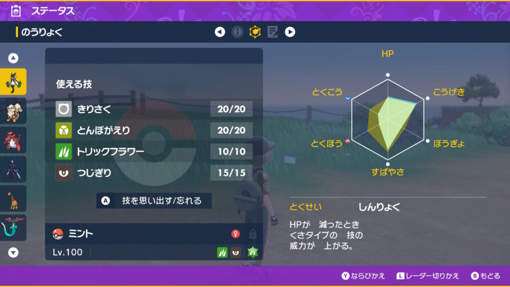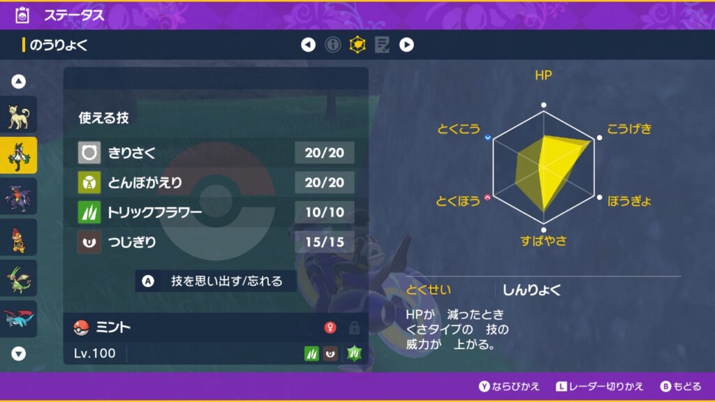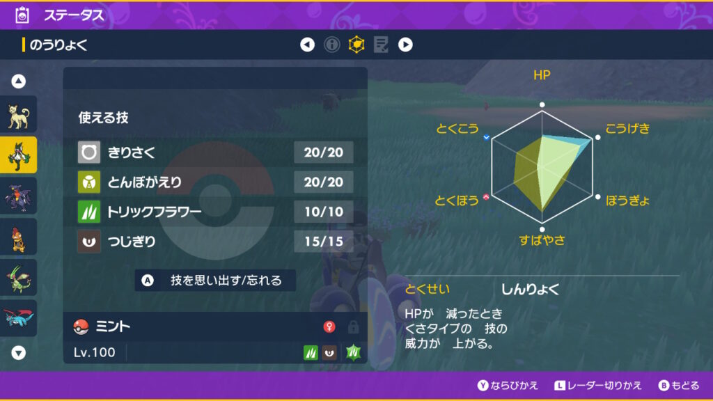 この「強さを見る」→「のうりょく」の画面でLボタンを押してレーダーを切り替えてみましょう。