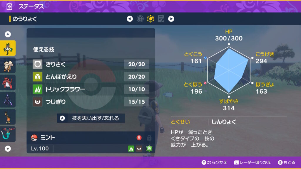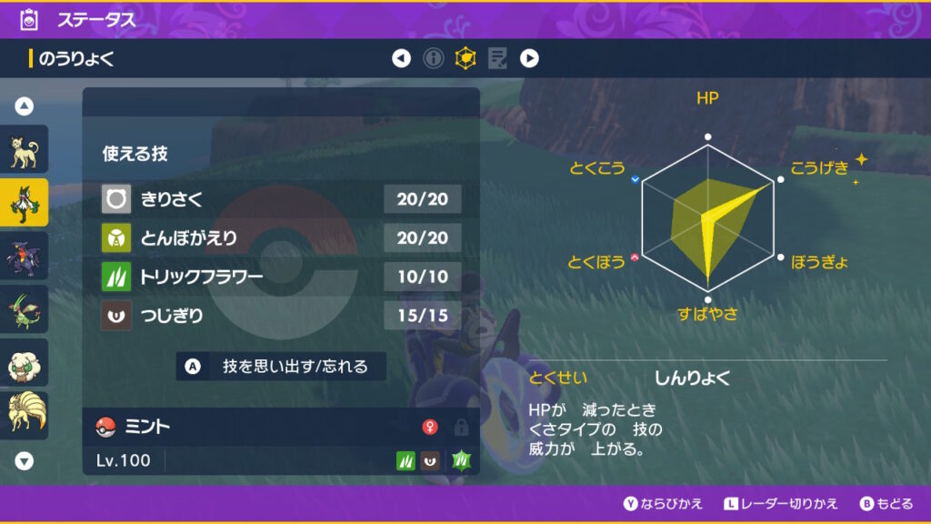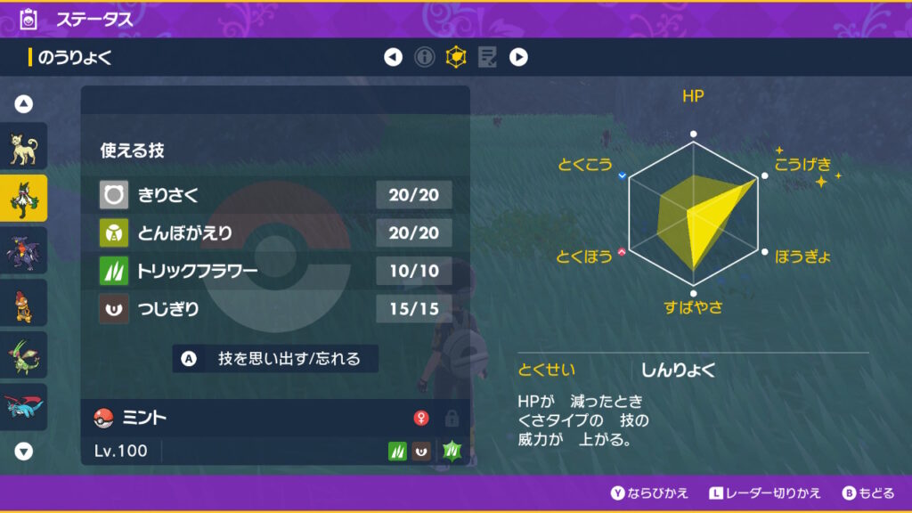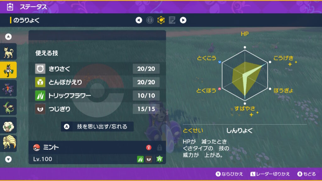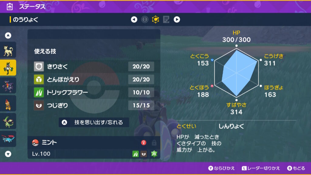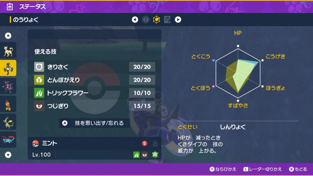この「強さを見る」→「のうりょく」の画面でLボタンを押してレーダーを切り替えてみましょう。