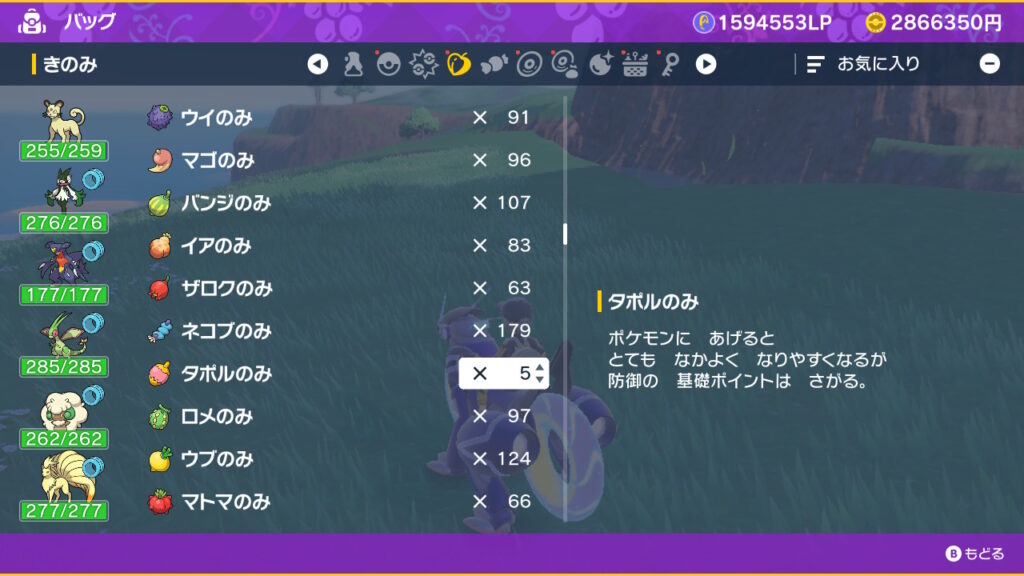 最後に防御の努力値を下げるタポルのみを使います。6個が上限でしたが、様子見で5個使用。