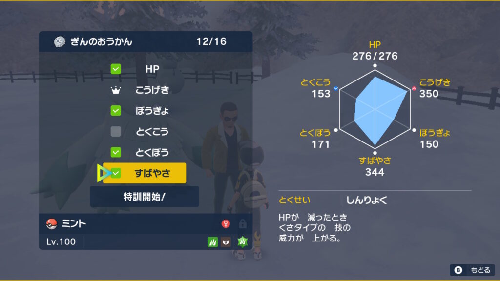 ミントちゃんは既に攻撃がさいこう、あと特攻は戦闘で使わない能力なので、それ以外の4能力をぎんのおうかんを使って上げていきます。
