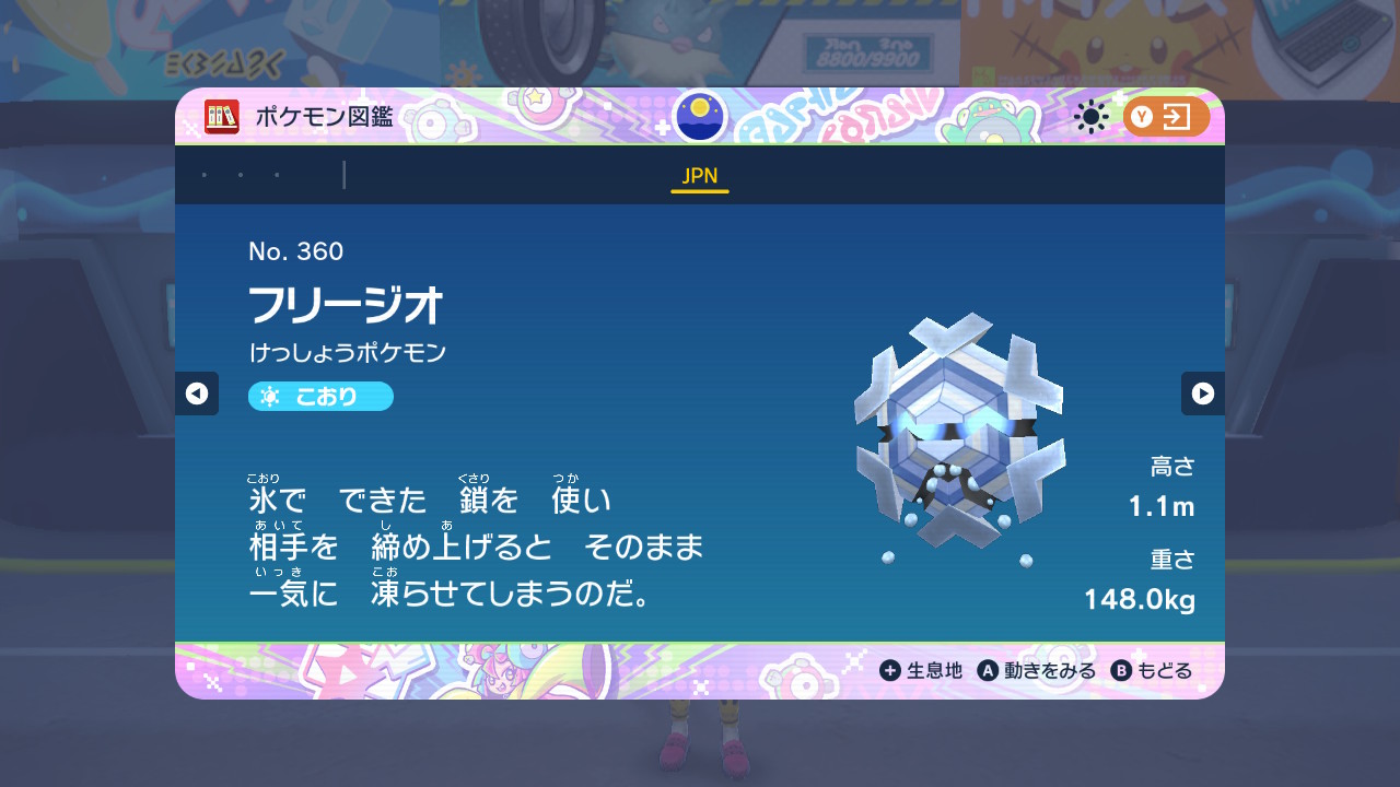 私は日本語を選択したトレーナーで、今のところマジカル交換でフリージオが手元に来たことがないので、現在図鑑はこのようにJPNのタブしかありません。
