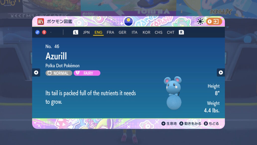 英語版のAzurill、ルリリ(瑠璃)とAzure(空色、青色、紺色)をうまく対応させているなと思います。